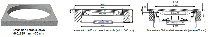 Betoninen korotuskehys 665x665 h=70mm | 2650632 | | Nelikulmainen 665x665 mm. Pyöreällä 600 mm aukolla. Tarkoitettu säädettävälle kehykselle 550/50 laippa nelikulmainen |