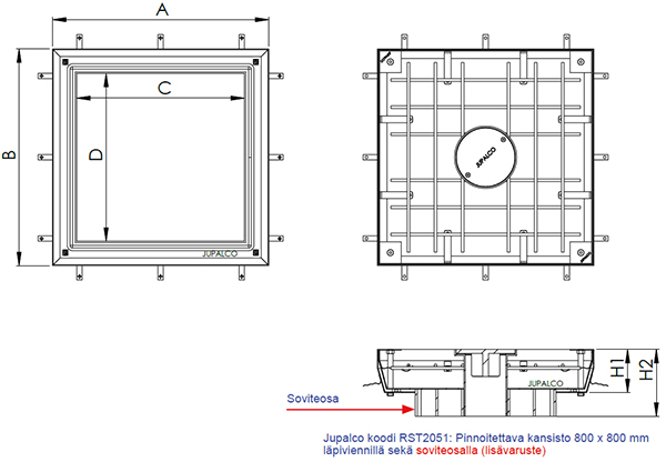 Pinnoitettava kansisto 800 x 800 tiivisteellä sekä läpiviennillä tarkastusluukun vapaa aukko 150mm | D400 (40tn) | 800 x 800 | 620 x 620 | 160 | RST2051 |