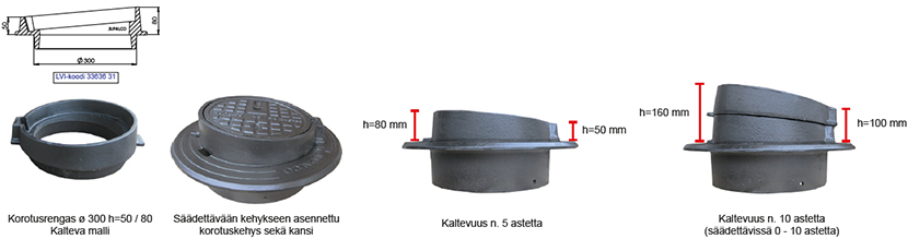 Korotusrengas ø 300 h=50 / 80 mm | 3363631 | | Kalteva malli. Korotus 50 / 80 mm Korotusrenkaita voidaan asentaa useampi päällekkäin. |