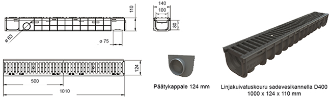 Linjakuivatuskouru PP100 Sadevesikannella D400 Poistoyhdevaraus 63 ja 75 mm | 1000 x 124 x 110 | D400 (40tn) | 3366600 | |
