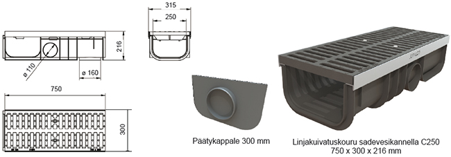 Linjakuivatuskouru PP250 Sadevesikannella C250 Poistoyhdevaraus 110 ja 160 mm | 750 x 300 x 216 | C250 (25tn) | 3366602 | |